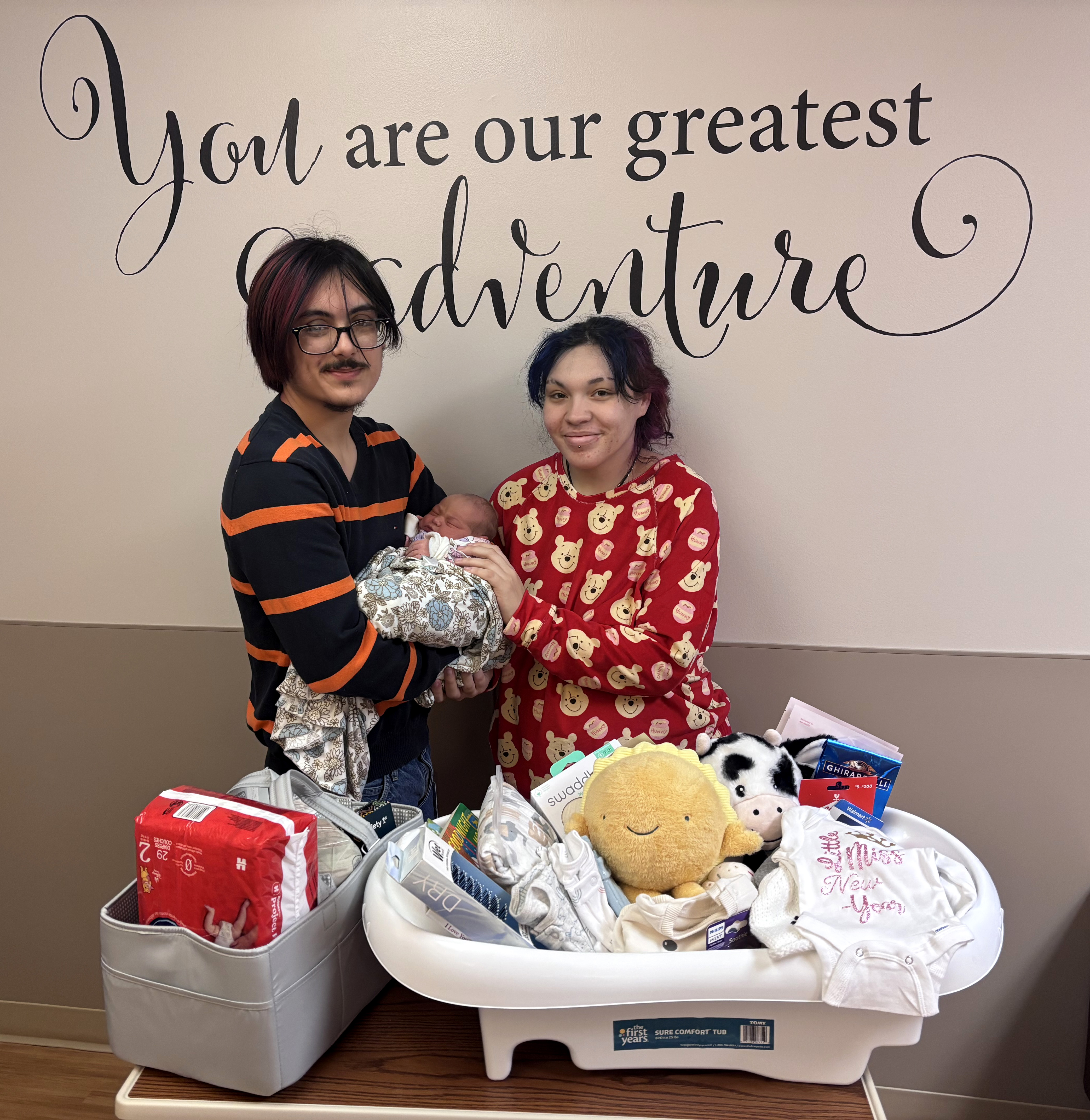 To celebrate, the Family Birth Center staff gifted the family a basket filled with goodies for baby Lola and her Mom. The basket included essentials such as diapers, wipes, a baby bathtub, books, storage bins, burp cloths, swaddles, a blanket, pacifiers, and other baby items. For the new mom, the basket featured chocolate, gift cards, and additional thoughtful treats.