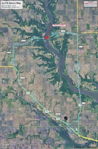When the bridge and roadway is closed you will follow a marked detour route that uses Iowa 210, Iowa 17, and Iowa 141.
