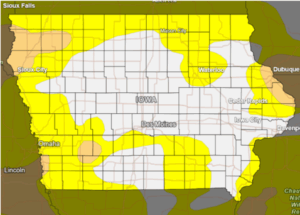 DES MOINES, Iowa—The U.S. Drought Monitor map this week shows a slight increase in drought conditions and an increase in Abnormally Dry conditions, especially in South Central Iowa. Locally, Boone, Story, Hamilton, Webster, and Greene Counties were still 100% drought free.
