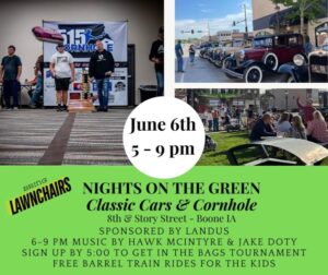 BOONE, Iowa—The first Friday of the month means another Friday Night on the Greene. This month it’s sponsored by Landus and includes Classic Cars and Cornhole, plus music, food trucks and more. Friday Night on the Greene will run 5:00p.m. until 9:00p.m. Story Street and 8th Street, a half block either side of Story Street will be closed to traffic during the event.