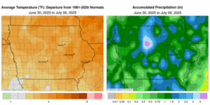 “Widespread showers and thunderstorms across Iowa helped close out a wetter than average June. July got off to a similar start, with hit-or-miss storms over the long holiday weekend. Chances of rain remain in the forecast for portions of the state this week,” said Secretary Naig. “Outlooks for the next few weeks indicate that warm weather is likely to stick around as we enter the peak of county fair season and an important period for corn and soybean development.”