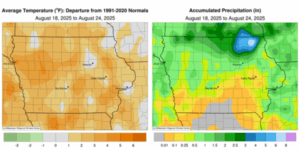 “Farmers across Iowa enjoyed a welcome break from the rain last week along with cooler temperatures and less humidity,” said Secretary Naig. “As we finish out August, the forecast calls for more of the same this week. Looking ahead, initial outlooks are pointing toward a potentially warmer September as harvest approaches.”