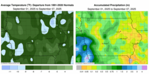 “We’ve heard some initial reports of farmers picking corn this past week in pockets of Iowa. Some early varieties of corn have started to turn quickly due to the dry August,” said Secretary Naig. “This past week’s cooler weather is expected to give way to some mid-September heat, with temperatures likely climbing back into the upper 80s and low 90s by this weekend.”