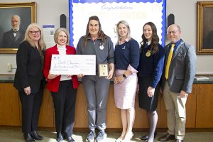 Barb Clawson, third from left, was announced as one of the 2026 Golden Owl awardees during a surprise gathering Feb. 23. Pictured with her are, left to right, Lori Lorenzen of Pledge Insurance Advisors – Story City, Shannon Latham of the Iowa FFA Foundation, Mallary Westhoff of Nationwide, Laura Steinkamp of the State FFA Officer team, and Alan Spencer of the Iowa Department of Education. Photo by Whitney Baxter