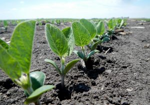 Young soybean plants emerging from soil. Photo by Daren Mueller, Iowa State University.