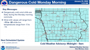 DES MOINES, Iowa—The National Weather Service Office in Des Moines has updated information concerning hazardous winter weather. Dangerous cold conditions are expected Monday morning over all of Iowa from midnight – 9 am Monday.