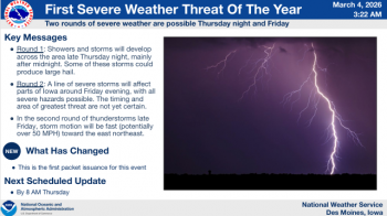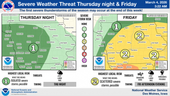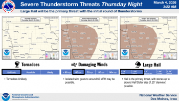 DES MOINES, Iowa—The National Weather Service Office in Des Moines has provided updated information concerning the potential for hazardous weather this week. Expectations are for severe thunderstorms (first threat of the year) over much of Iowa. The first round is expected late Thursday night and a second round around Friday evening.