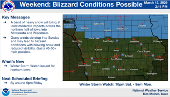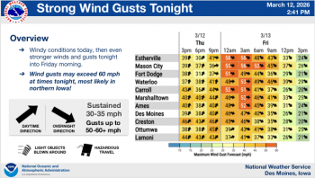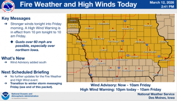 DES MOINES, Iowa—The National Weather Service Office in Des Moines has provided updated information concerning hazardous weather affecting Iowa. Overnight there’s a High Wind Warning and Wind Advisory; to the north a Winter Storm Watch. Strong winds 50-60+ mph are expected across much of Iowa; heavy, blowing snow across northern Iowa. High Wind Warning 10pm tonight til 10am Friday; Winter Storm Watch 10pm Saturday to 9am Monday.