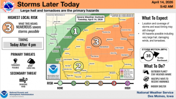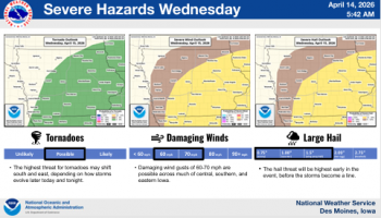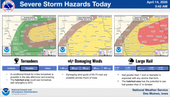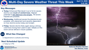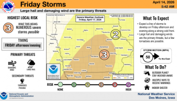 DES MOINES, Iowa—The National Weather Service Office in Des Moines has provided updated information concerning possible severe weather and heavy rainfall. Multiple potential rounds of severe storms and heavy rainfall possible mostly across the southeastern two thirds of Iowa today, Wednesday, and Friday.
