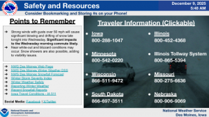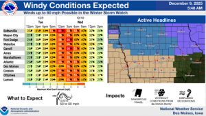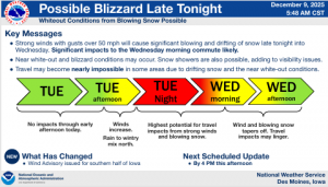 DES MOINES, Iowa—The National Weather Service Office in Des Moines has made available updated information for hazardous winter weather expected today. Blizzard conditions from strong winds and blowing snow are expected over northern and portions of central Iowa late tonight and Wednesday morning.