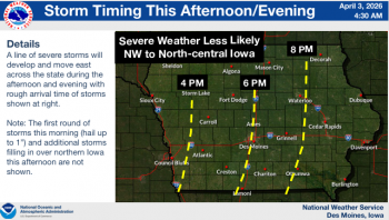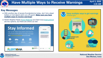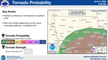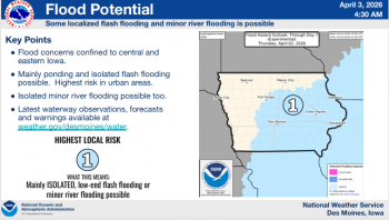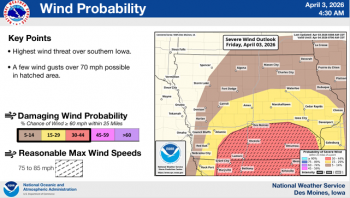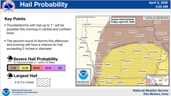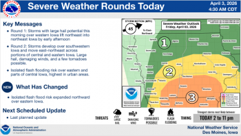 Local News Weather Service Updates Severe Weather Projections KWBG 04/03/26 DES MOINES, Iowa—The National Weather Service Office in Des Moines has provided updated information concerning the potential for severe weather and heavy rainfall across much of the state today. (contributed weather information, NWS) About the Author KWBG Administrator View All Posts Post navigation Previous: KWBG Local Sports for April 3rd Related Stories Local News Iowa Nutrient Research Center Releases 2025 Annual Review KWBG 04/02/26 Featured Images Local News Boone Fire Department Part of Mutual Aid Call for Story City Fire Department, Follows Up with Structure Fire on Tuesday KWBG 04/02/26 Local News Boone Water Works Releases Consumer Confidence Water Quality Report KWBG 03/31/26