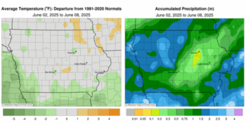 Several rounds of showers and thunderstorms brought widespread rainfall over the state with above-average amounts in western Iowa; east-central Iowa reported 0.50-1.00 inch deficits. Temperatures were near-normal to slightly cooler for much of Iowa through June’s first week with a statewide average temperature of 66.3 degrees, 0.9 degrees below normal.